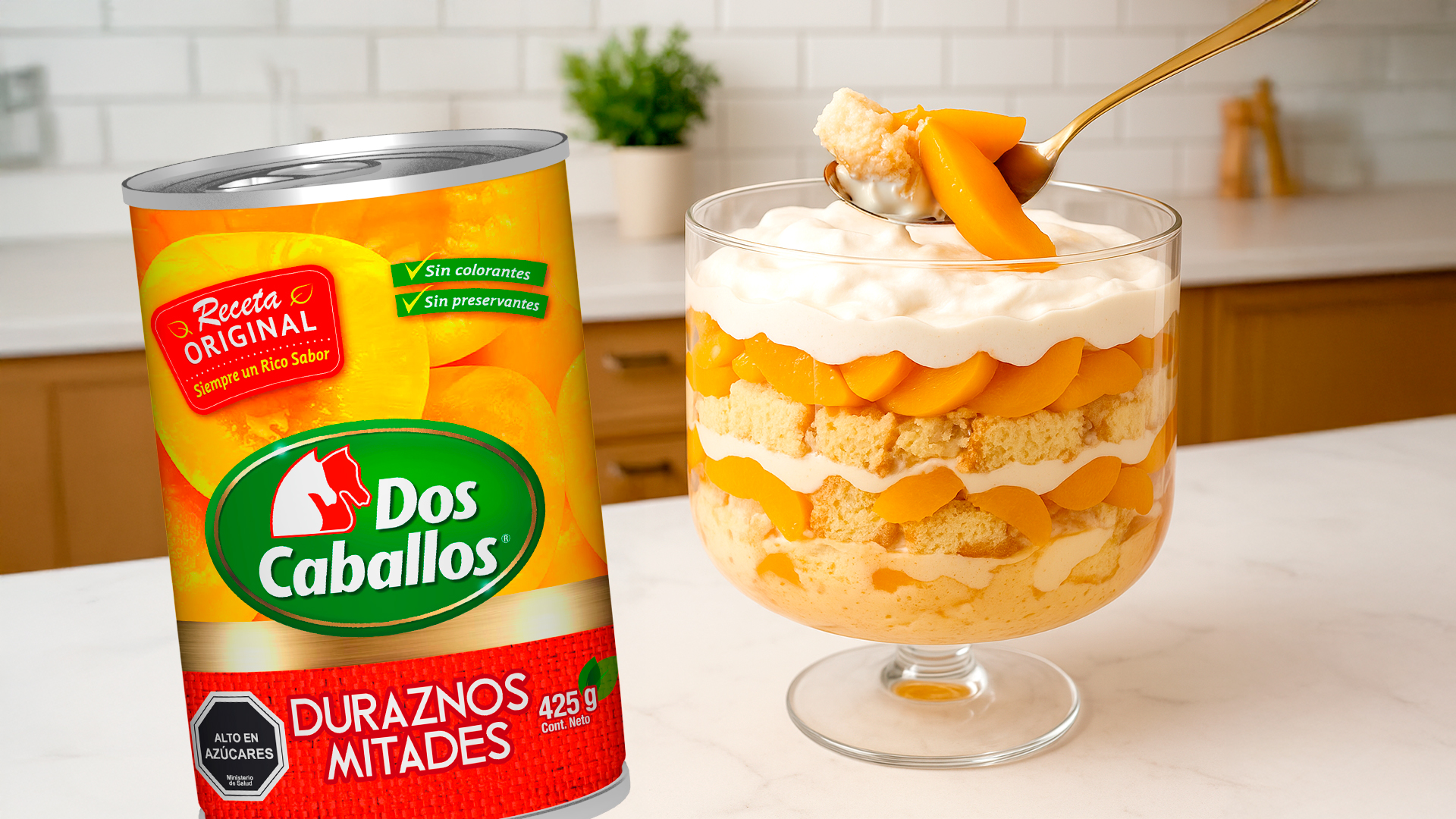 - 2 tarros de duraznos en mitades de 380 g Dos Caballos.